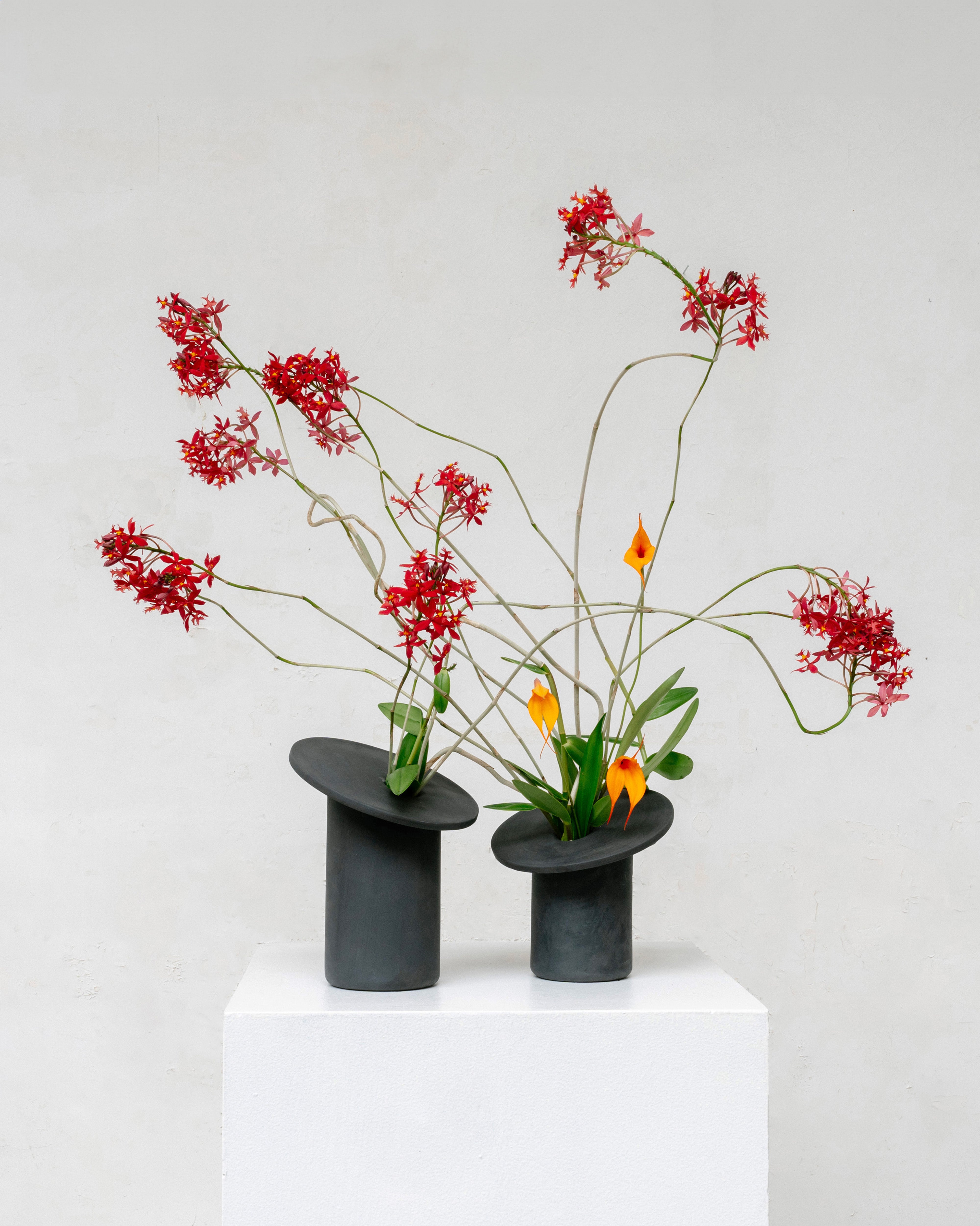 "The name refers to the balance that the discus appears to seek, including its relation to the other vase. But it is also a balancing act between function and pure object, playful and static, extrovert and introvert, rugged masculine and elegant feminine. The Balancing Vases have something sculptural but are also functional and go together as objects in communication when they are together.”